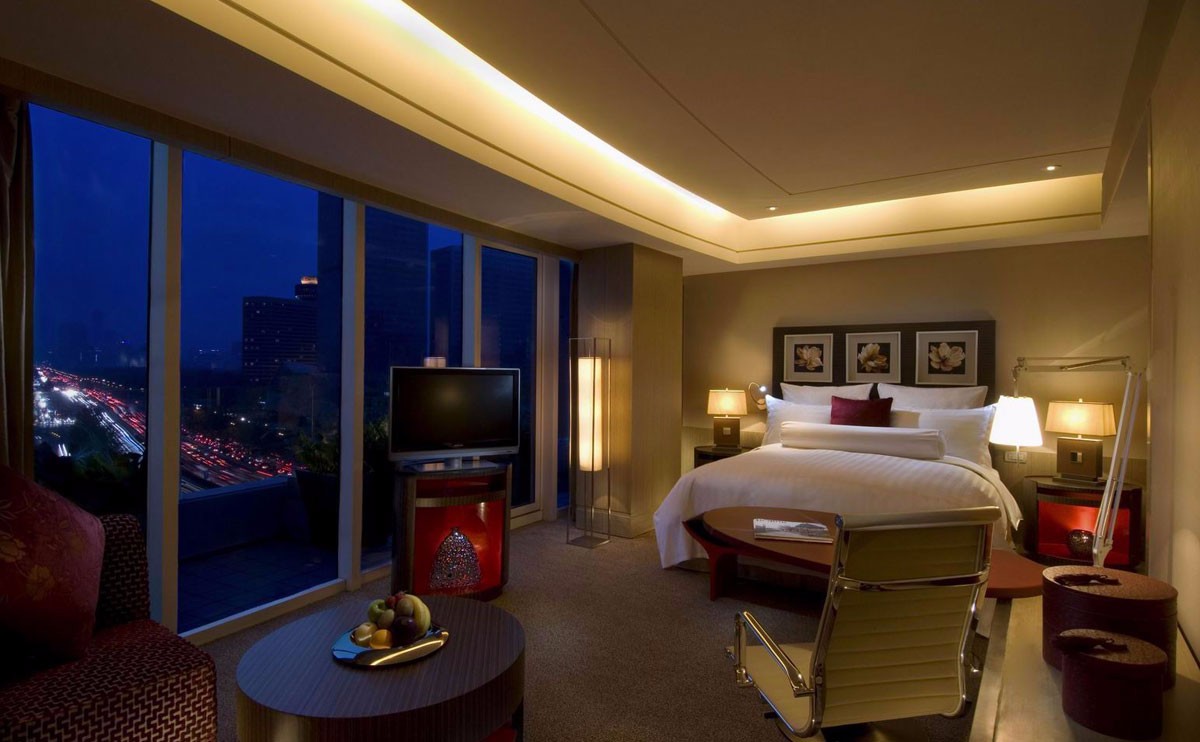 165平方米中备有宽敞高雅的起居室、餐厅和书房,卧室内装饰的金色吊灯让房间充满温暖与奢华的感觉。透过落地窗便可俯览北京繁华的使馆区,整个房间备有B&O顶级影音设备以及设计师家具,展现更高层次的品味与入住体验。主席套房 立即预订