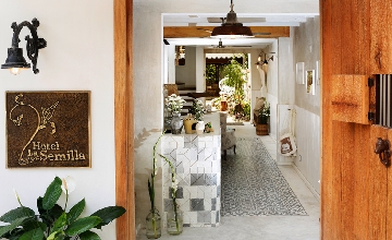 Local authenticity was a guiding principle in the refurbishment of the white geometric building that houses Hotel La Semilla, a structure that conforms to Playa del Carmen’s prevailing architectural style, while the interior design is clearly influenced by owners Alexis Schärer and Angie Rodriguez’s experiences around the world. Concrete flooring is inspired by Greece; mosaic tiles are distinctly Yucatán; and industrial loft-style spaces point towards New York City, while furniture ranges from modern to antique.